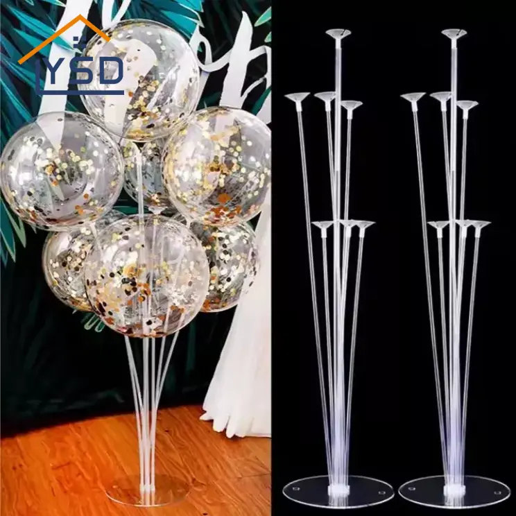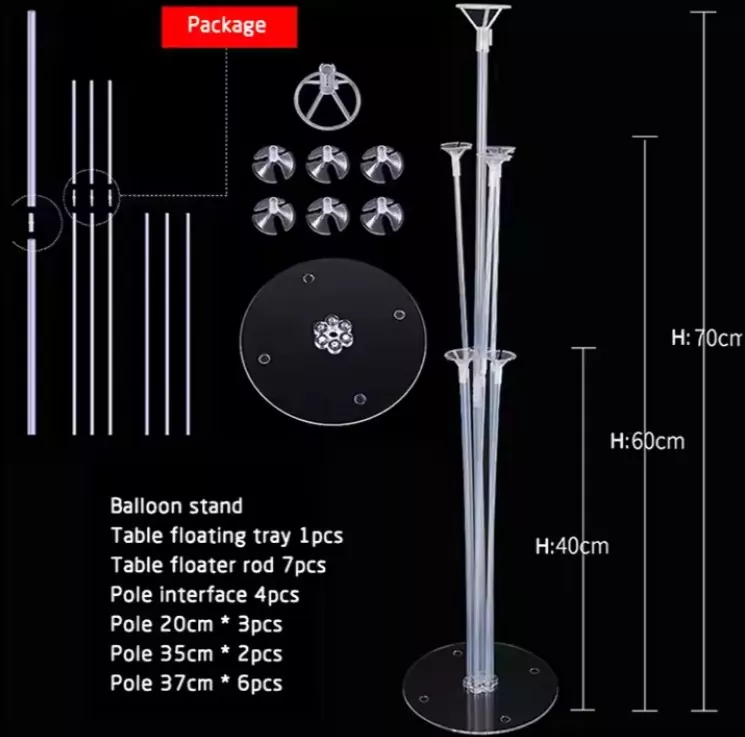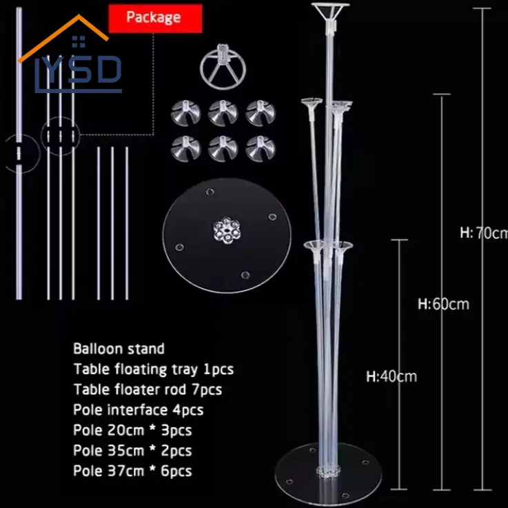 El soporte del globo suele ser transparente. Los globos apilados juntos tienden a verse rígidos. El soporte de globo transparente de YSD no es solo una altura. Hay diferentes longitudes en un juego de soporte de globo. Por ejemplo, el mejor que vendemos es una combinación de 70 cm, 60 cm y 40 cm. Hay un 70 cm, 3 60 cm y 3 40 cm. Se combinan con globos para hacer los globos dispersos y ordenados. Este efecto "escalonado" se logra completamente por estos soportes transparentes de diferentes longitudes.