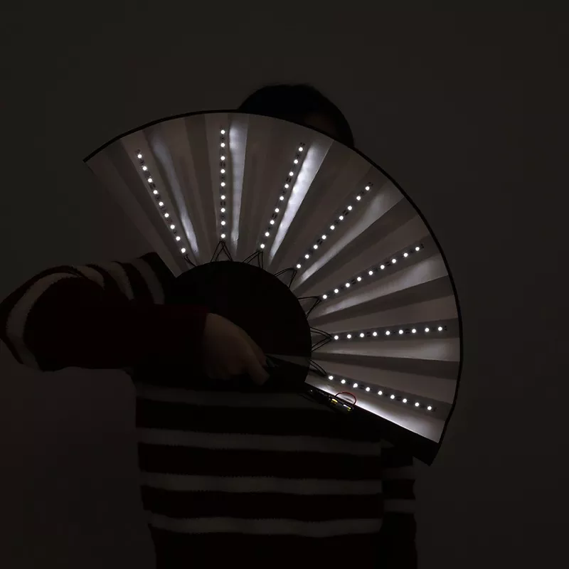 Entonces estás en medio de la pista de baile. El ritmo cae y mueves la muñeca: el ventilador se enciende al instante. Suaves ondas de arco iris, patrones brillantes y parpadeantes: cambian según tu estado de ánimo. No sólo es práctico; es parte de tu vibra. Muévelo al ritmo y pintarás el aire de luz. Todos lo notan.
